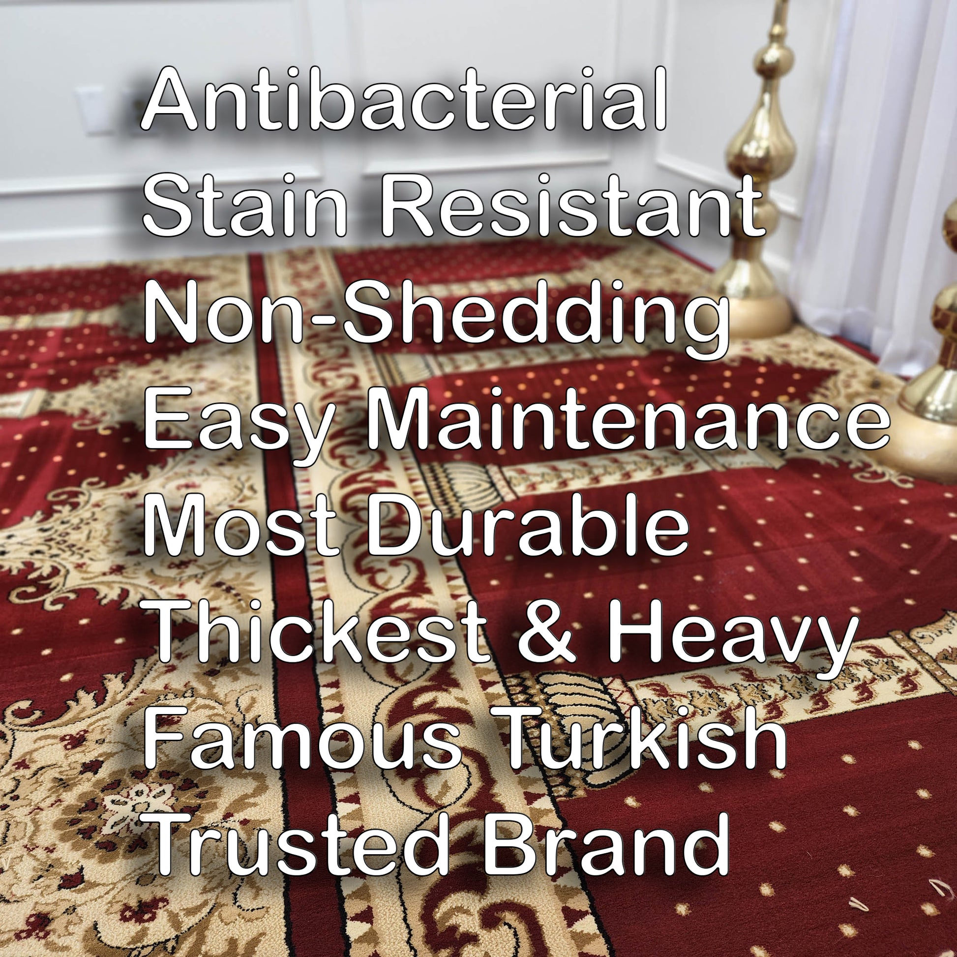 Mosque carpet is for your home, basement or a different room in your home. All the four edges are finished. You will just lay the carpet, ready for your prayers. This is the softest and best quality of famous Turkish mosque carpeting. 14mm (half inch) thickness make it comfy to pray on.